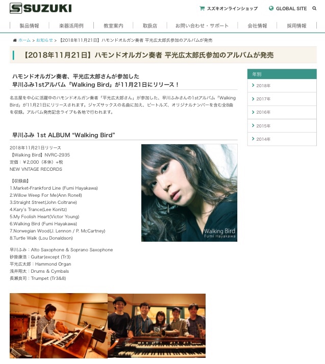 ハモンドオルガンの”鈴木楽器製作所”さんのウェブサイトで1st ALBUM ”Walking Bird”を紹介していただきました。是非チェックしてみてください!