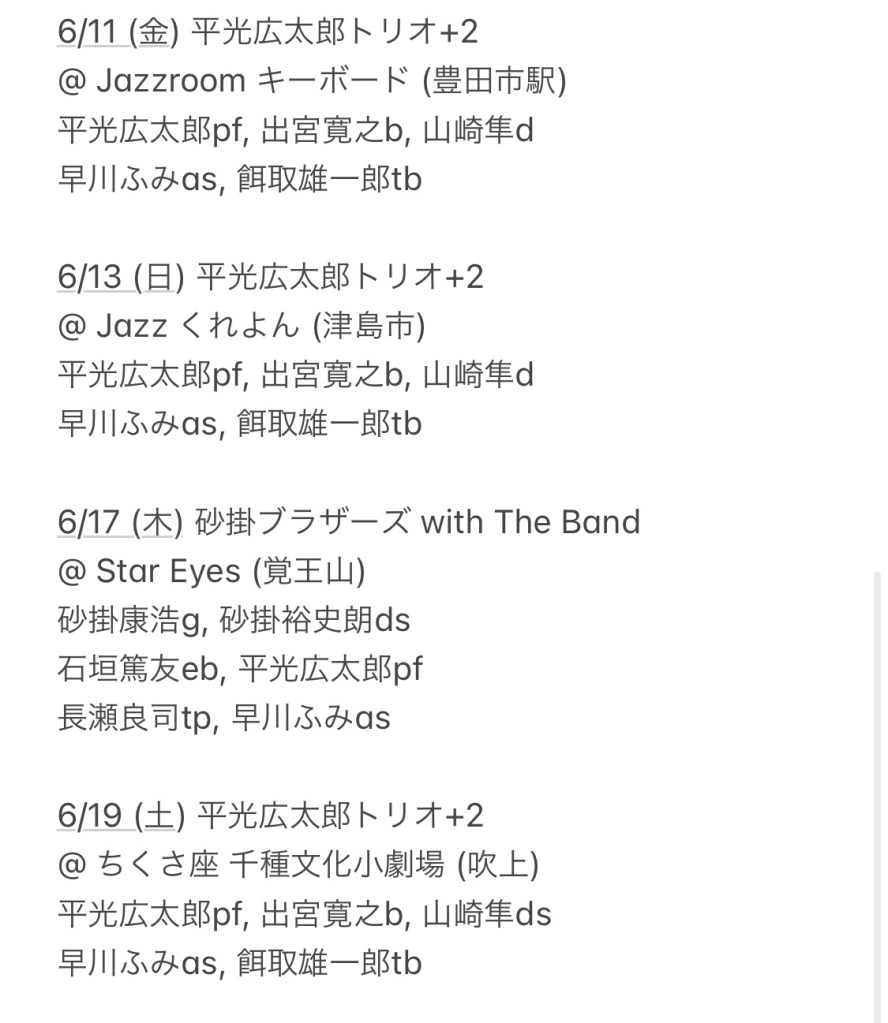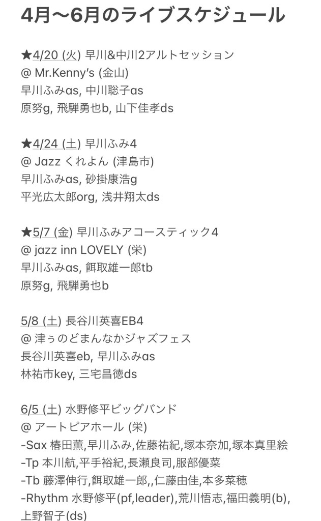 先取りスケジュール fumihayakawa Uncategorized 3月 30, 20213月 30, 2021 1 Minute 共有: クリックして X で共有 (新しいウィンドウで開きます) X Facebook で共有するにはクリックしてください (新しいウィンドウで開きます) Facebook いいね 読み込み中… 投稿者: fumihayakawa 名古屋を拠点に活動するジャズサックス奏者早川ふみです。 fumihayakawa の投稿をすべて表示 公開済み 3月 30, 20213月 30, 2021