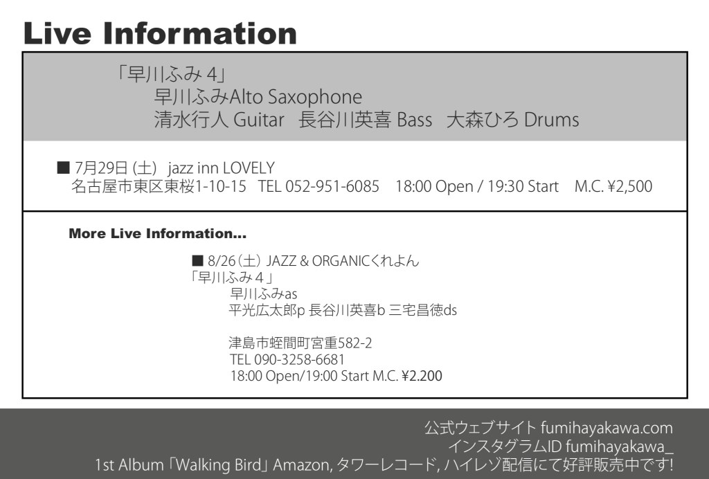 2023 summer fumihayakawa Uncategorized 7月 4, 20237月 4, 2023 1 Minute 久しぶりにふみカードをつくりました、印刷できてきたら貰ってください!7/29土曜日のラブリーも是非よろしくお願いします。 共有: クリックして X で共有 (新しいウィンドウで開きます) X Facebook で共有するにはクリックしてください (新しいウィンドウで開きます) Facebook いいね 読み込み中… 投稿者: fumihayakawa 名古屋を拠点に活動するジャズサックス奏者早川ふみです。 fumihayakawa の投稿をすべて表示 公開済み 7月 4, 20237月 4, 2023